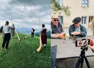 Mit der Idee im Sack, hüpfen wir als nächstes in einen Video Call mit Ursula Signer. Zusammen mit Andi Cortellini hat sie das Buch «Hobby Buddies» konzipiert und umgesetzt (mittlerweile mein lieblings Foto-Buch aus der Schweiz). Schweizer Tradition gemischt mit einer ganzen Portion Absurdität. Wie macht man das? «Wir sollen einfach fragen, hartnäckig bleiben, recherchieren nochmals fragen und am Schluss machen. Wir hätten ja schon ein grafisches Auge, so sollte es mit den schönen Hintergründen kein Problem sein». Sehr inspiriert von diesem Gespräch machen wir uns an die Szenenauswahl und fangen an, Leute zu kontaktieren, die wir gerne im Video hätten. «Bleibt aber auch spontan» riet uns Ursula noch zuletzt. Das wollen wir – und so wird unser Video eine Mischung aus organisierten Shots, und spontanen Momentaufnahmen - Natürlich, wie immer mit viel mehr Zeit und Aufwand als gedacht. (Siehe Kalender-Einträge)